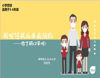 面对新型肺炎的严峻疫情,我们全国上下都积极配合国家的政策,认真佩戴口罩来降低病毒的传播力度。但是在疫情期间,我们发现很多人都不会正确佩戴口罩,不会重视口罩的作用。而正确佩戴口罩不仅仅是疫情期间所必须的,更是在日常生活中需要掌握的基本技能。因此,本课例从口罩的作用和类型、口罩的结构、自制口罩、口罩正确佩戴方式和处理方式等方面出发,让学生能正确使用口罩发挥口罩的真正用处。同时,在本节课中学生通过视频来学习用身边的常见的材料来制作简易口罩,主动探索口罩隔离病毒的原理,达到寓教于乐的真实效果。学生通过争做小小实践家和监督员,向身边的家长们宣传口罩的正确佩戴方式,也为此次疫情贡献自己小小的一份力量。